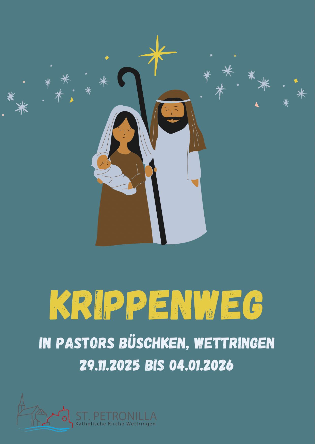 In diesem Jahr wird zum zweiten Mal der ganztägig öffentlich zugängliche Krippenweg (29.11. bis 04.01.2026) organisiert. Der Krippenweg wird ein wenig erweitert. Er führt dieses Mal durch das kleine Waldstück „Pastors Büschken“ und darf in Richtung Elisabeth-Stift ausgebaut werden. Privatpersonen, Vereine u. Institutionen gestalten individuelle Krippen mit künstlerisch wertvollem Anspruch. Wir freuen uns auf viele Besucher und besinnliche Stunden. Pastor`s Büschken befindet sich gegenüber der St. Petronilla Kirche.